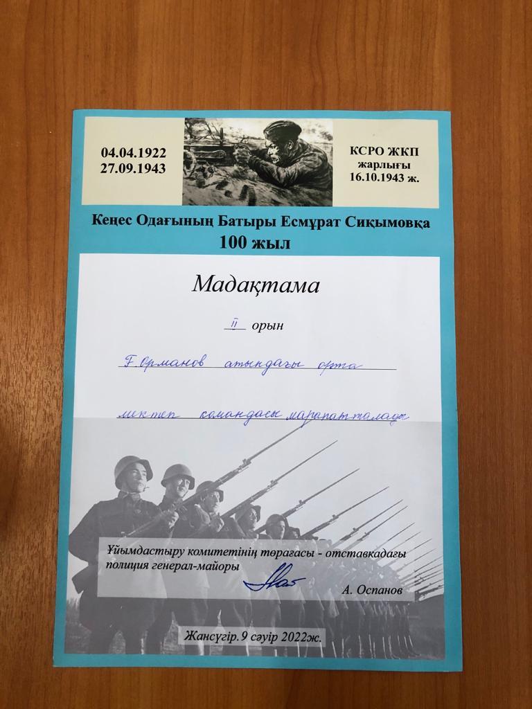 Сәуір айының 9 күні Кеңес Одағының Батыры Есмұрат Сиқымовтың 100 жылдығына орай Ақсу ауданында мектеп оқушыларына арналған волейболдан аймақтық турнир өтілді. Мектеп оқушылары бақ сынасып, "Ғали Орманов атындағы" қыздар волейбол командасы ІІ орын иеленді.9 апреля в Аксуском районе прошел региональный турнир по волейболу для школьников, посвященный 100-летию Героя Советского Союза Есмурата Сикимова. В соревнованиях приняли участие учащиеся школы, где женская волейбольная команда "им. Гали Орманова" заняла ІІ место.