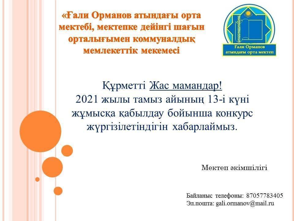 10 август 2021 0 1 2 3 4 5 2021 жылы тамыз айының 13-і күні жұмысқа қабылдау бойынша конкурс жүргізілетіндігін хабарлаймыз!