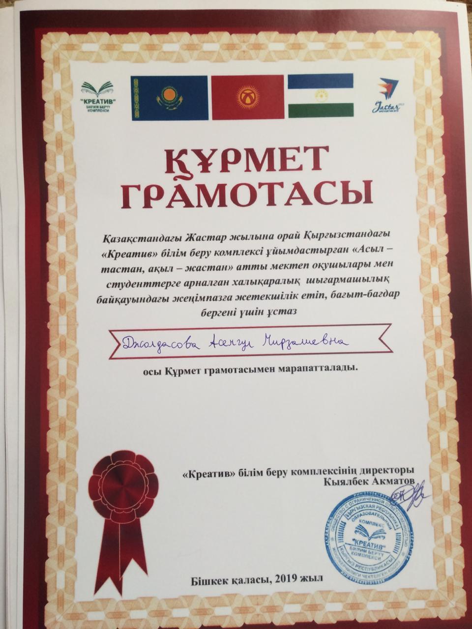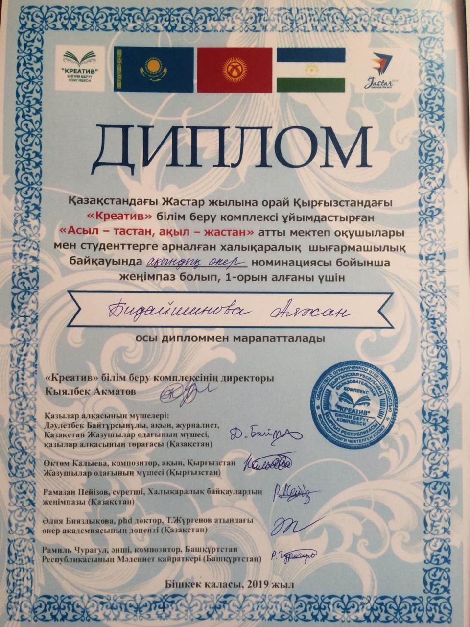 Ғали Орманов атындағы орта мектебінің 3 «А» сынып оқушысы Бидайшинова Аяжан желтоқсан айының 24 жұлдызында Алматы қаласындағы А.П. Чехов атындағы кітапханасында Қазақстандағы Жастар жылына орай Қырғызстандағы «Креатив» білім беру комплексі ұйымдастырған «Асыл - тастан, ақыл - жастан» атты мектеп оқушылары мен студенттерге арналған халықаралық шығармашылық байқауында «Ақындық өнер» номинациясы бойынша жеңімпаз болып І – орын алып дипломмен марапатталды.Жеңімпазға жетекшілік етіп, бағыт – бағдар бергені үшін сынып жетекшісі Жолдасова Асемгүл Құрмет грамотасына ие болды.