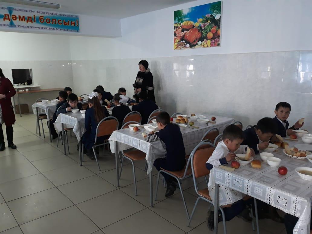 Тұлдыр жетім 1, жартылай жетім 4, аз қамтылған 16, сәтсіз отбасынан 1 және көпбалалы отбасынан 24 оқушыларға берілетін ыстық тамақтың сапасын қадағалау мақсатында комиссия құрылды. Ыстық тамақтың сапасы күнделікті қадағалауға алынып, бақылау жұмыстары жүргізіліп отырады. Комиссия құрамында мектеп директоры – Г.Ешмухамбетова, Мектеп директорының ТЖО-Т.Б.Батырбаева, әлеуметтік педогог Д.К.Рамазанов,бастауыш сынып мұғалімі - Р.Б.Ақашева, жалпы мектепішілік ата-аналар комитетінің төрайымы- Ә.Темірбекова, қамқоршылық кеңесінің төрағасы Ә.Нобаев,мектеп психологі- А.Ш.Салманова. Сараптама комиссиясы әр айдың басында балаларға келген азық-түлікті тізбектеп, АКТ жасап қабылдап алады. Аптасына бір рет зерделеу жұмыстарын жүргізізіп, мектепте оқушыларға берілетін тегін тамақтың азық-түлігінің сапалы болуын, сақтау мерзімін күнделікті ас мәзіріне сәйкес болуы қадағаланады. Асханада ас мәзірі бұрышында меню және кезекшілік кестесі ілініп тұр. Сынып жетекшілер тамақ ішу уақытысында кесте бойынша кезекшілікке шығады.