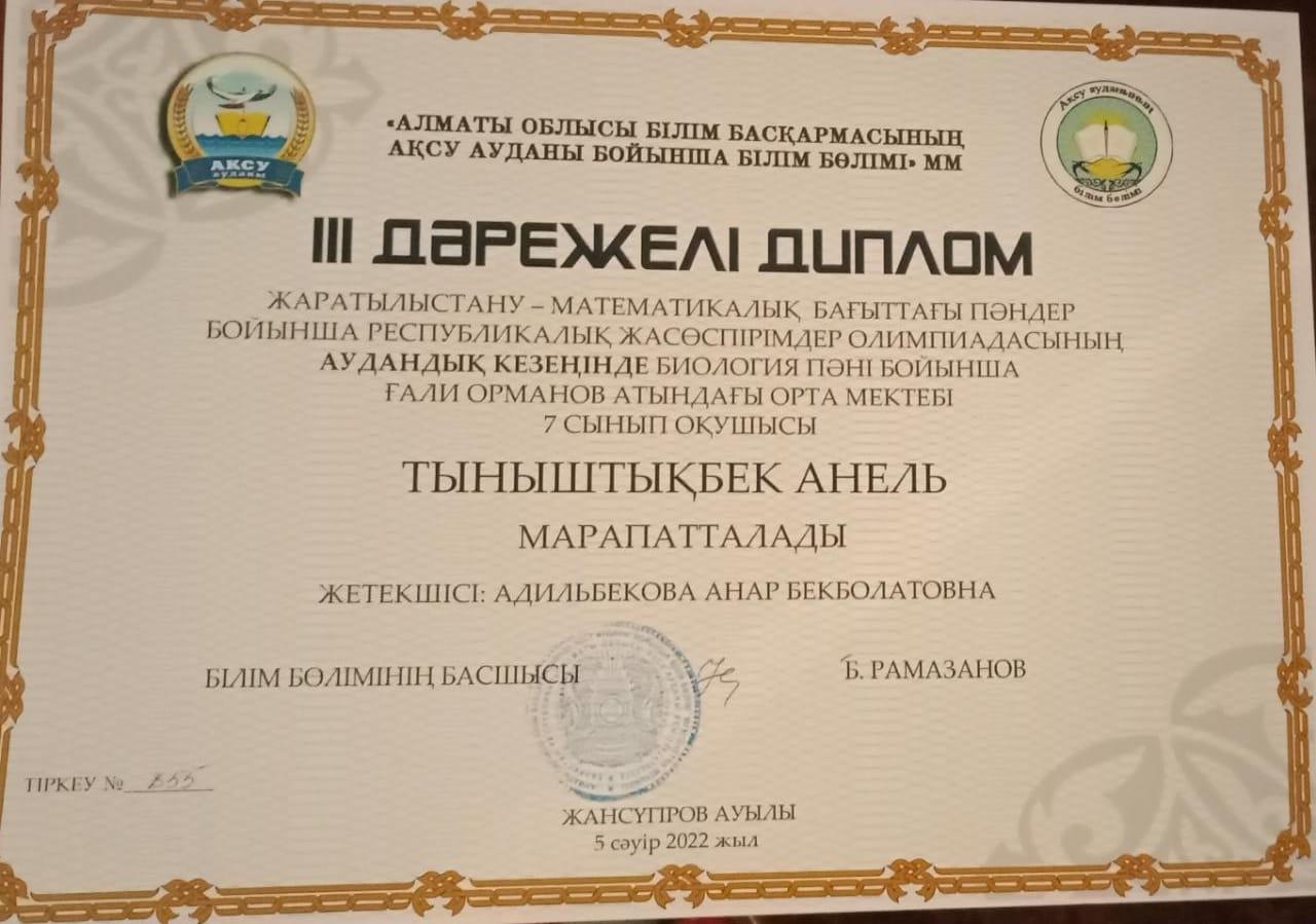 At the district stage of the Republican Youth Olympiad in subjects of natural and mathematical direction, a student of the 8th grade Bakytnurkyzy Zerde was awarded a diploma of the III degree, a student of the 7th grade in biology Tynyshtykbek Anel was awarded a diploma of the III degree. Congratulations!