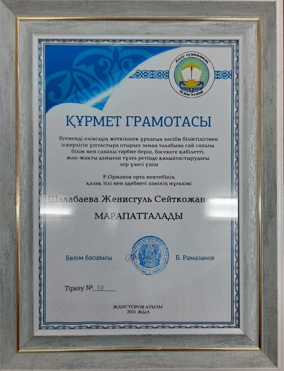 Құрмет грамотасы » "Ғали Орманов атындағы орта мектебі мектепке дейінгі шағын орталығымен" коммуналдық мемлекеттік мекемесі