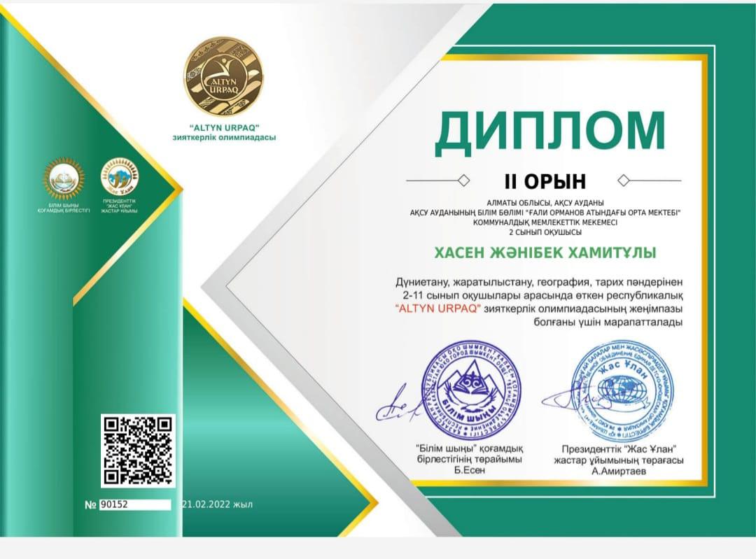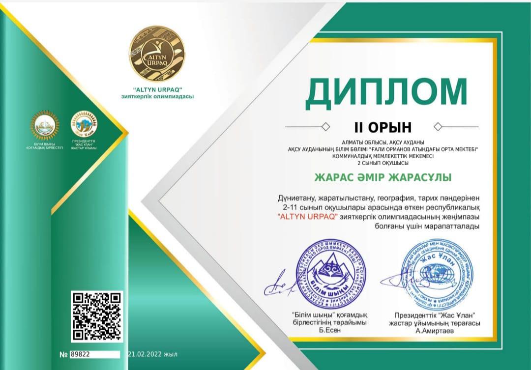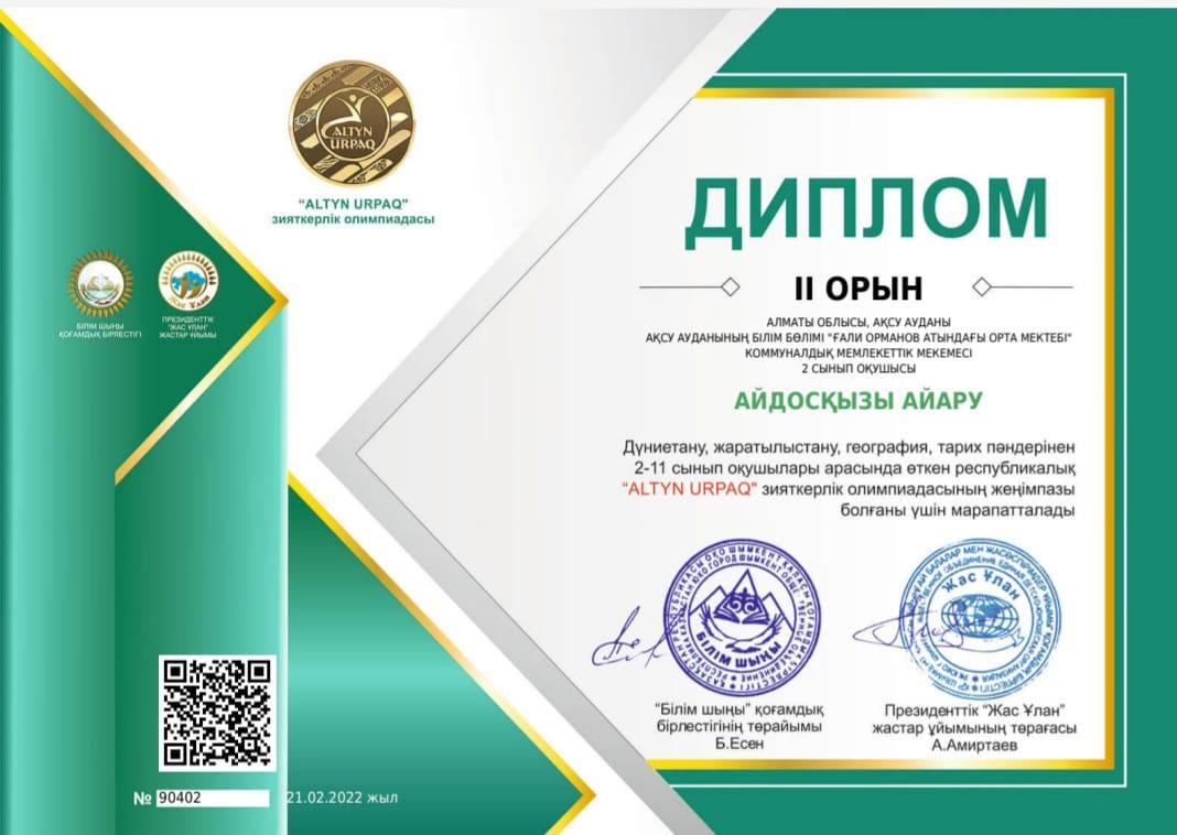 2022 жылдың 21 ақпан күні Дүниетану, жаратылыстану, география, тарих пәндерінен 2-11 сынып оқушылары арасында өткен республикалық ALTYN URPAQ" зияткерлік олимпиадасының жеңімпаздары.