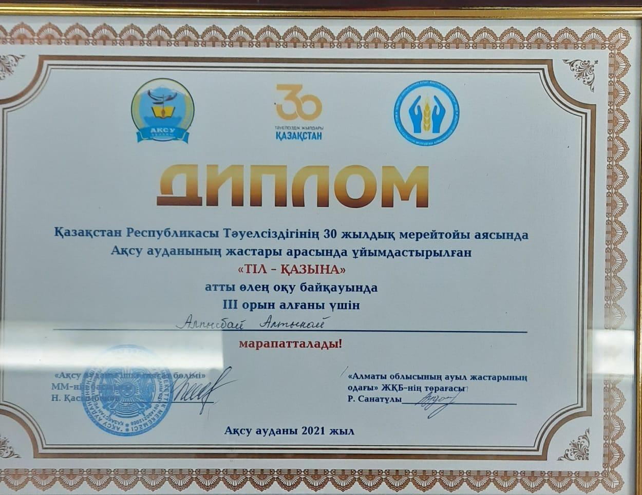 Қазақстан Республикасы Тәуелсіздігінің 30 жылдық мерейтойы аясында Ақсу ауданының жастары арасында ұйымдастырылған "ТІЛ - ҚАЗЫНА " атты өлең оқу байқауында ІІІ орын алғаны үшін Алпысбай Алтынай марапатталады.