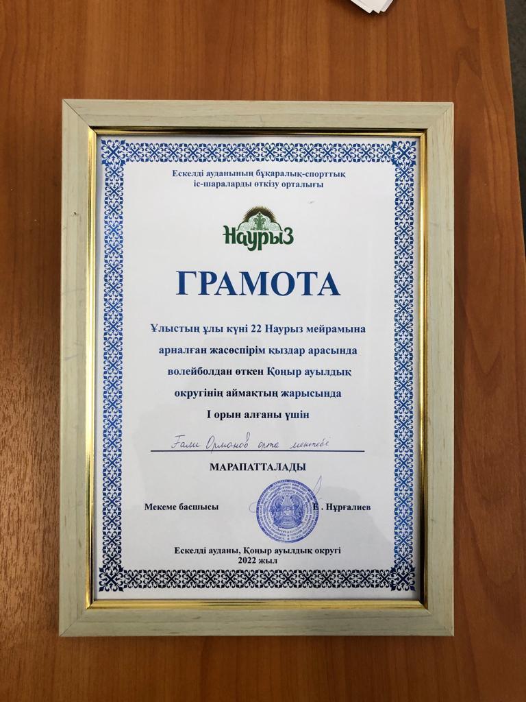 Volleyball among teenage girls dedicated to the Great Day of the Nation March 22 was held in Konyr village of Aksu district. In the regional competition of Konyr rural district the girls of "Gali Ormanov Secondary school" took the first place.