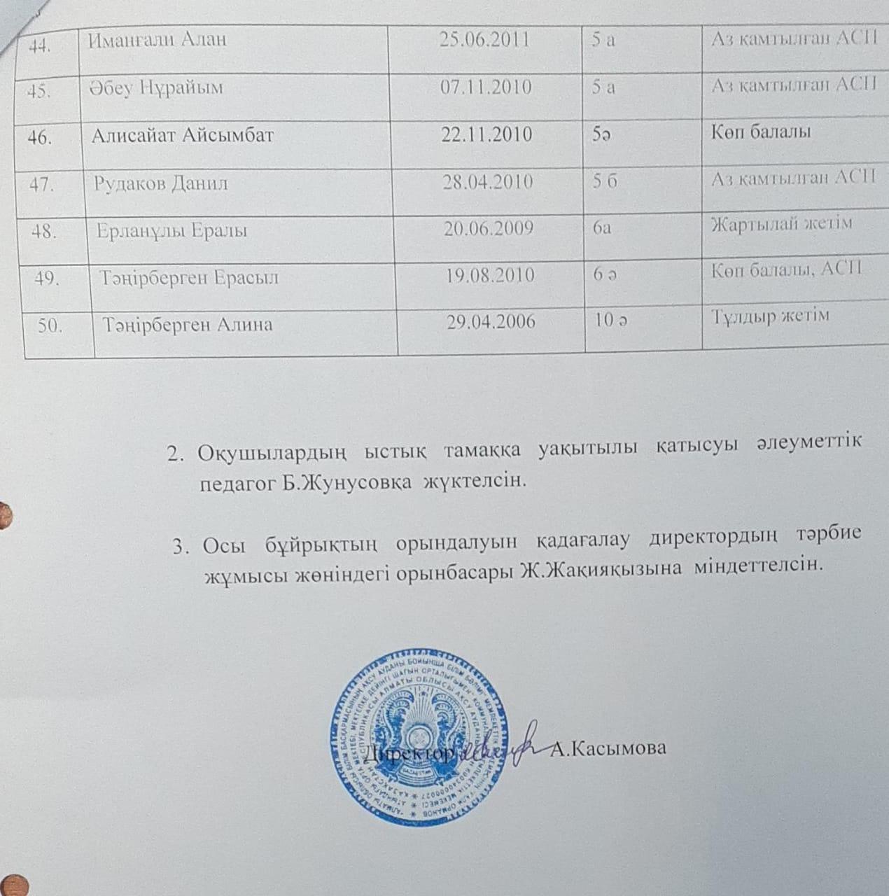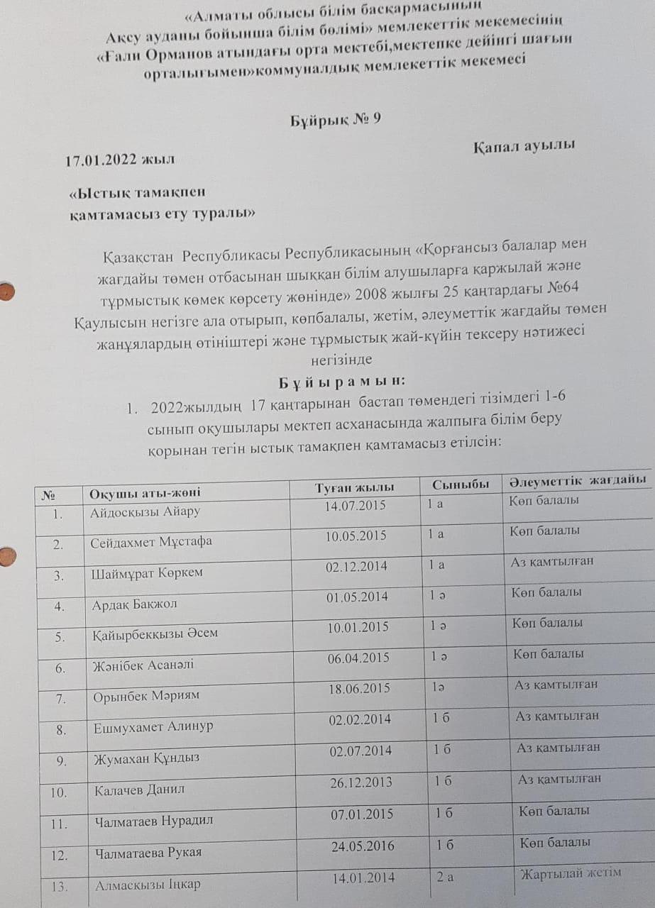 Ыстық тамақпен қамтамасыз ету туралы About providing hot meals. » "Ғали Орманов атындағы орта мектебі мектепке дейінгі шағын орталығымен" коммуналдық мемлекеттік мекемесі